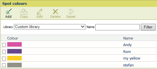 Biblioteki kolorów spotowych w programie Settings EditorProgram Settings Editor może przechowywać trzy typy bibliotek kolorów spotowych: