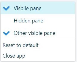 Selon l'application, les informations affichées peuvent être réparties en un ou plusieurs panneaux. Vous pouvez basculer la visibilité d'un panneau (à condition qu'il ne s'agisse pas du dernier). Vous pouvez également annuler toutes les modifications apportées à la disposition et à la position des panneaux à l'intérieur de l'application en utilisant l'entrée de menu [Réinitialiser les valeurs par défaut] sous l'ellipse verticale