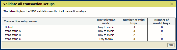 Пример отчета о проверке для всех настроек транзакционной печатиПроверьте количество недопустимых лотков и при необходимости примите надлежащие меры.