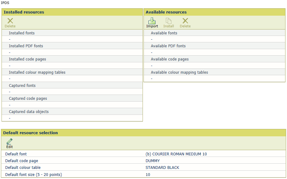 Captured resources: The IPDS host can download a resource via the IPDS data stream if a required resource is not available on the printer. To increase the performance, the downloaded resources can be captured on the printer disk for later reuse. After capturing, the IPDS host gets informed about available captured resources but still must activate the captured resources. Captured resources are visible in the Settings Editor. Only when the [Font capture] setting in the loaded transaction setup is enabled the capturing of resources can take place. This setting also controls whether captured or installed resources are selectable.