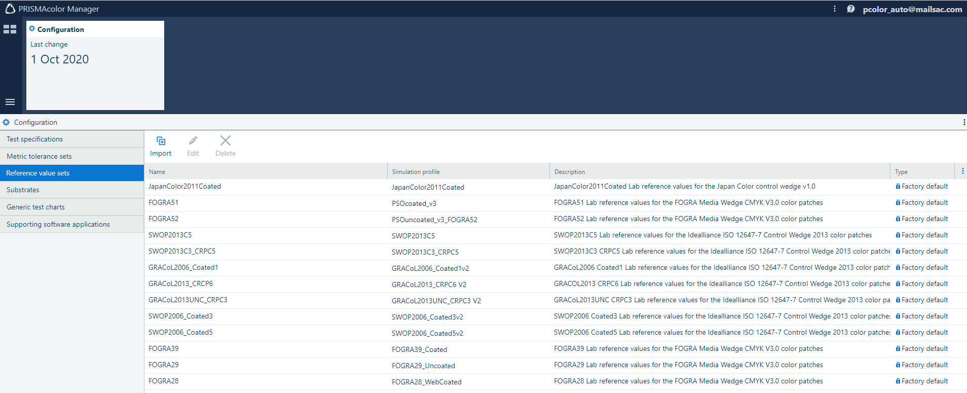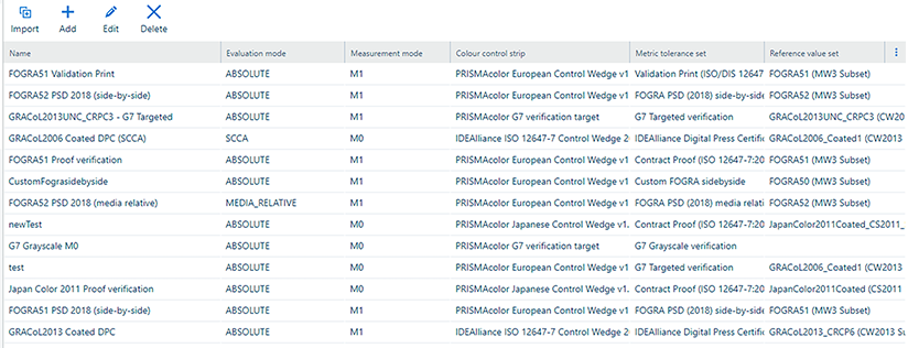 Rediger et referenceværdisæt. Du kan ændre navnet, beskrivelsen af referenceværdisættet samt navnet på simuleringsprofilen. ![]() Referenceværdisættet kan kun slettes, hvis det ikke bruges i en farvetest. Elementerne for [Fabriksstandard] kan ikke slettes eller redigeres. Når du har justeret referenceværdisættet, skal du klikke på knappen [Gem]. |