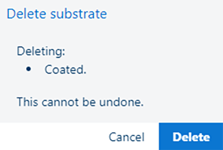 Slet substratet. Denne handling kan ikke fortrydes. Substratet kan kun slettes, hvis det ikke bruges i en farvetest. ![]() Hvis du er sikker på, at du vil slette det metriske tolerancesæt, skal du klikke på knappen [Slet]. |