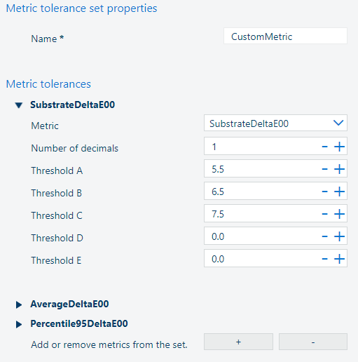Tilføj et brugerdefineret metrisk tolerancesæt. Hvis du vil tilføje et nyt metrisk tolerancesæt, skal du definere mindst to målinger. ![]() Brug knapperne + og - for at tilføje eller fjerne en metrisk værdi fra sættet. ![]() Når du har defineret metrikken, skal du klikke på knappen [Gem] for at gemme det metriske tolerancesæt. |