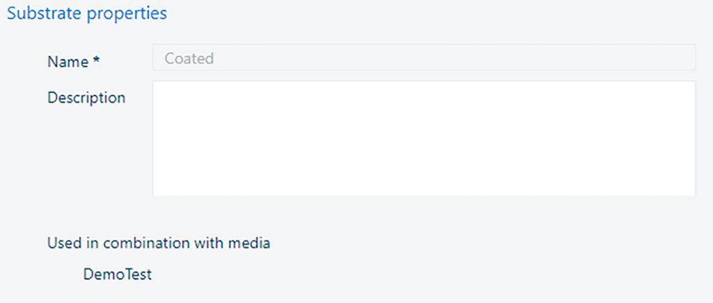 Rediger substratet. Navnet på substratet kan kun redigeres, hvis det ikke bruges i en farvetest. Beskrivelsen kan altid redigeres. ![]() Når du har justeret substratet, skal du klikke på [Gem] -knappen. |