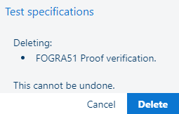 Slet testspecifikationen. Denne handling kan ikke fortrydes. Testspecifikationen kan kun slettes, hvis den ikke bruges i en farvetest. ![]() Hvis du er sikker på, at du vil slette testspecifikationen, skal du klikke på [Slet] -knappen. |