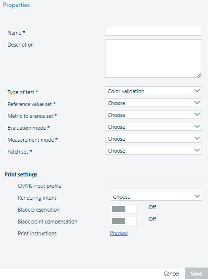 Rediger testspecifikationen. Testspecifikationen kan kun redigeres, hvis den ikke bruges i en farvetest. Beskrivelsen og udskrivningsinstruktionen kan dog altid redigeres. ![]() Når du har justeret indstillingerne, skal du klikke på [Gem] -knappen. |