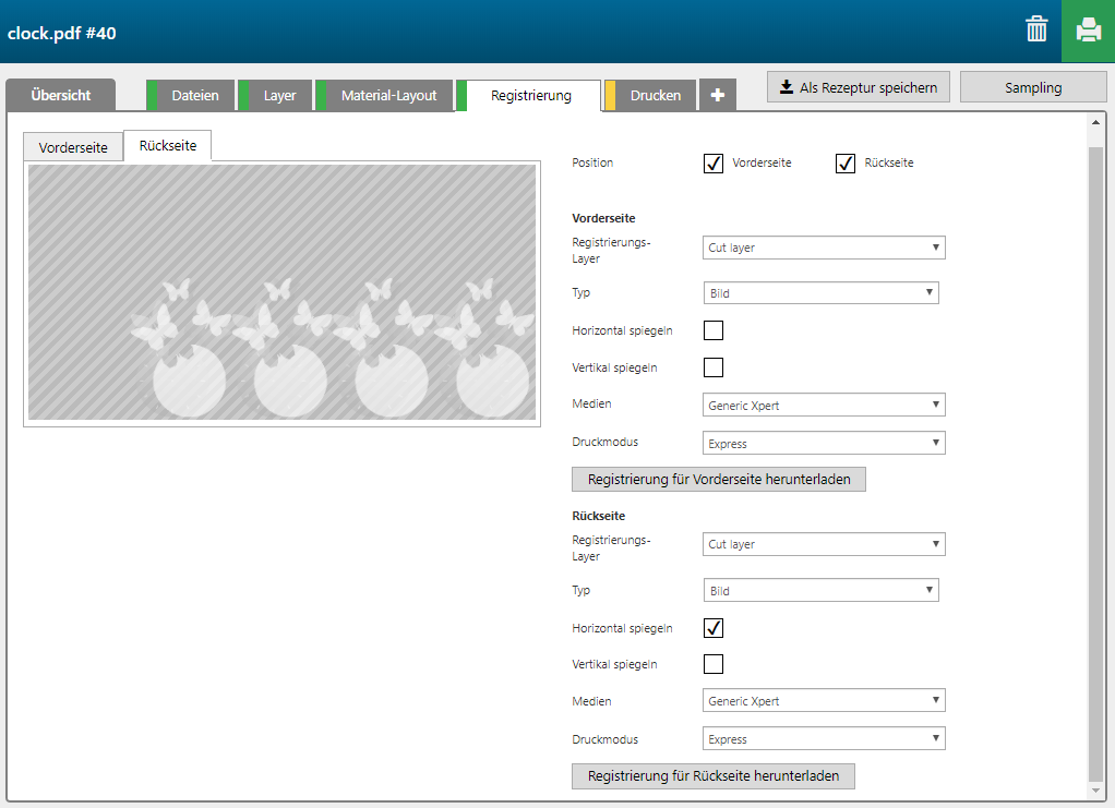 Bei symmetrischen Grafiken brauchen Sie die Informationen auf dem Registrierungs-Layer nur einmal zu drucken. Dies liegt daran, dass Sie dieselbe Druckausgabe zum Ausrichten der Vorderseite und der Rückseite des Materials verwenden können.