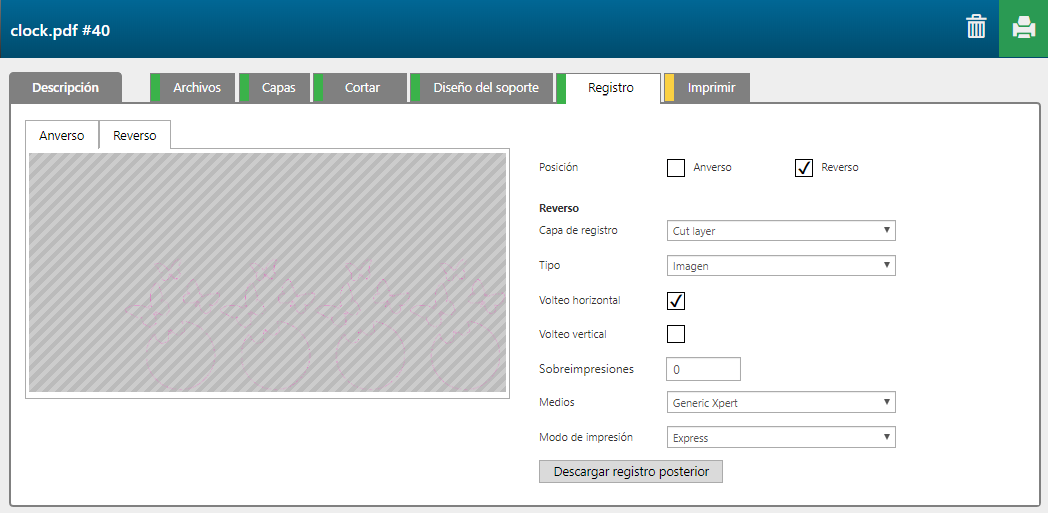 Pulse el botón [Descargar registro posterior] para descargar un archivo PDF de registro. Puede generar un archivo jig basado en el archivo PDF de registro. |