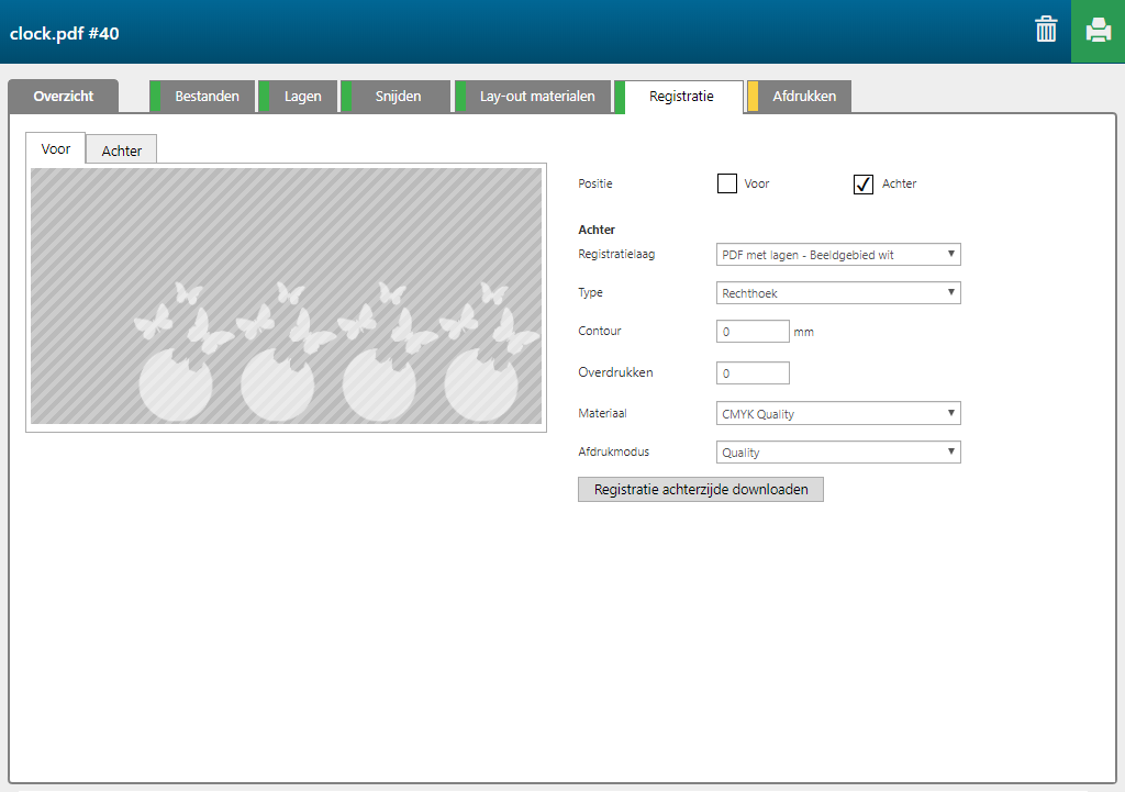 Klik op de knop [Registratie achterzijde downloaden] om een registratie-PDF te downloaden. Op basis van de registratie-PDF kunt u een mal maken. |