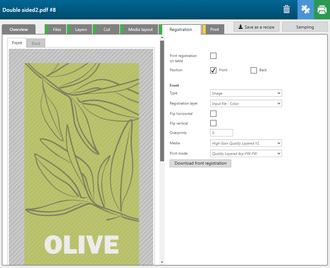 Wählen Sie in ONYX Thrive das Materialprofil aus, das den zum Drucken des Registrierungs-Layers gewünschten Druckmodus enthält. |