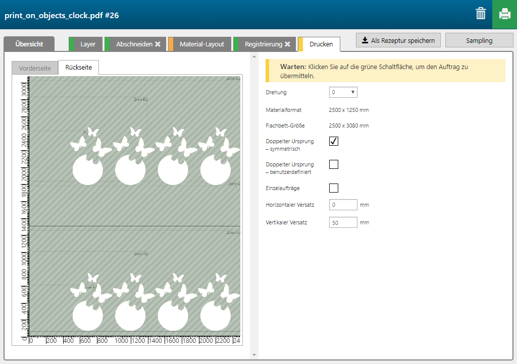 Aktivieren Sie dieses Kontrollkästchen, wenn Sie auf mehreren Druckträgern symmetrisch drucken wollen. Beispiel: Platzieren Sie einen Druckträger unten links, und starten Sie den Druckvorgang. Platzieren Sie während des Drucks einen weiteren Druckträger oben rechts. Diese Option ist natürlich nur verfügbar, wenn die Anzahl der Kopien größer als 1 ist. |