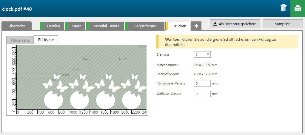Diese Option ist nur verfügbar, wenn Sie eines der Kontrollkästchen [Doppelter Ursprung – symmetrisch] oder [Doppelter Ursprung – benutzerdefiniert] aktiviert haben. Aktivieren Sie dieses Kontrollkästchen, wenn Sie jeden Druckauftrag oder Stapelauftrag einzeln an den Drucker senden möchten. Erklärung: Wenn Sie Druckaufträge oder einen Stapelauftrag an beiden Enden eines XT-Tisches drucken möchten, haben Sie zwei Möglichkeiten: