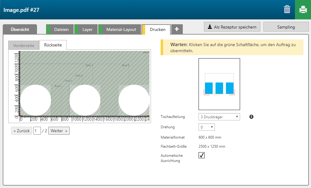 Unterhalb der grafischen Darstellung des Druckauftrags wird die Anzahl der Platten angezeigt. Klicken Sie auf [Zurück] oder [Weiter], um anzuzeigen, in welcher Reihenfolge die Platten bedruckt werden. |