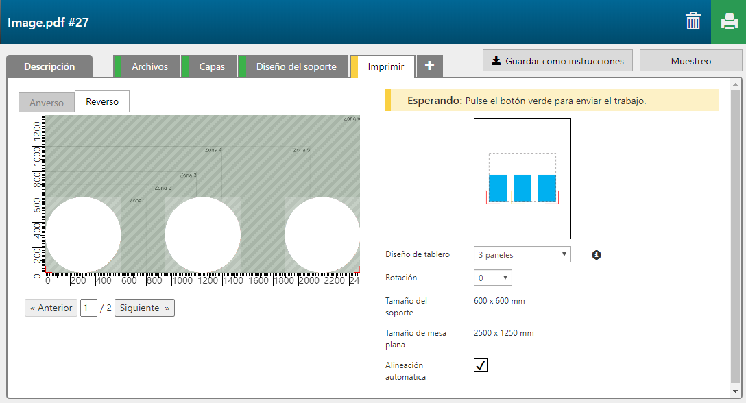 [2 paneles (uno por zona de vacío)] [Se enviará a la impresora un único lote (con los 2 paneles).] Solo para mesa de XT y XTF. |
