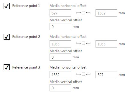 [5 Druckträger] [Mehrere Druckträger gleichzeitig bedrucken.] Für die Ausrichtung der Materialien auf dem Tisch stehen drei Referenzpunkte zur Verfügung. Sie können die Versatzwerte für Referenzpunke mit denen in den Arizona-Einstellungen abgleichen. |