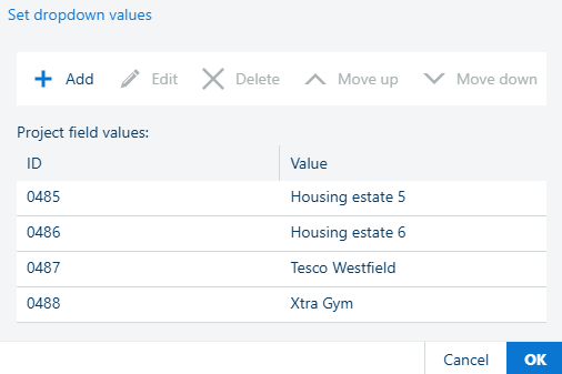Valori per il campo “Progetto”Al termine, selezionare [OK] per chiudere la finestra di dialogo.
