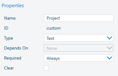 I panelen [Egenskaper], som finns till höger i arbetsytan, anger du [Namn] för det första anpassade fältet: [Projekt]: