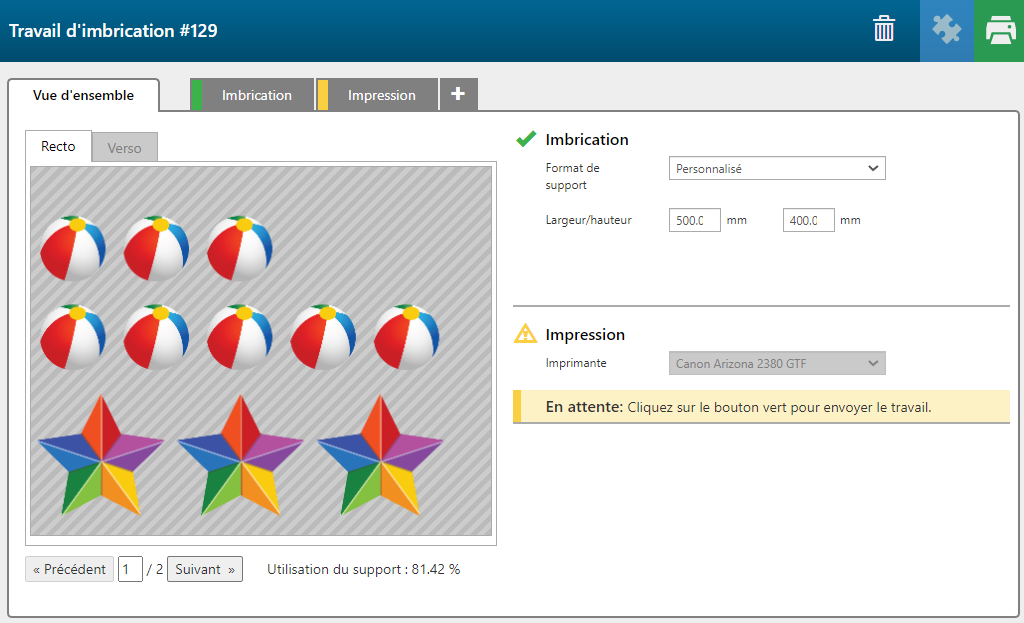 PRISMAguide XL vous permet de sélectionner de multiples travaux et de les imbriquer sur un ou plusieurs panneaux, selon le nombre de copies de chaque travail. L'imbrication est réalisée sur la base d'un rectangle et offre des paramètres personnalisables tels que les marges, l'espacement et la rotation.