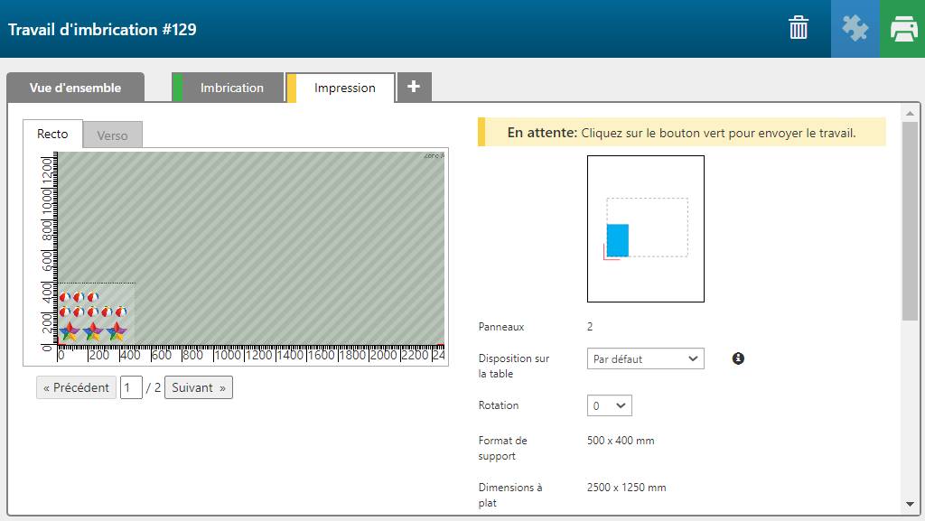 Les travaux dotés du paramètre : [Coupe, Impression] ne peuvent pas être envoyés en imbrication. Les travaux dotés du paramètre : [Impression, Coupe] peuvent être imbriqués.