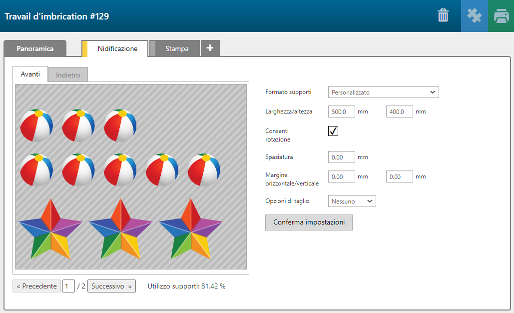 In PRISMAguide XL è possibile selezionare più lavori e nidificarli insieme su uno o più pannelli a seconda delle copie di ciascun lavoro. La nidificazione viene eseguita su base rettangolare e ha impostazioni personalizzabili come margini, spaziatura, rotazione.