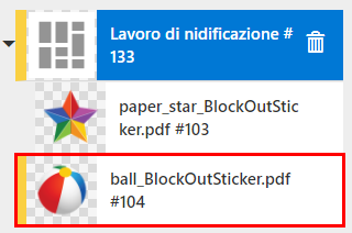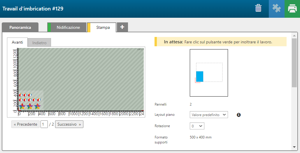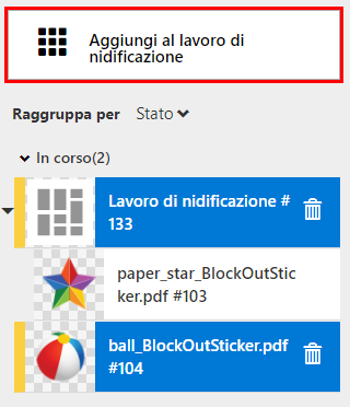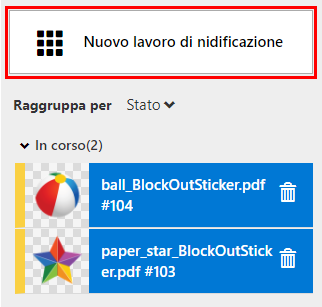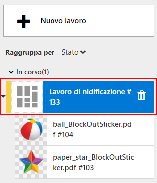 I lavori che hanno l'impostazione: [Taglio, Stampa] non possono essere inviati alla nidificazione. I lavori che hanno l'impostazione: [Stampa, Taglio] possono essere nidificati.
