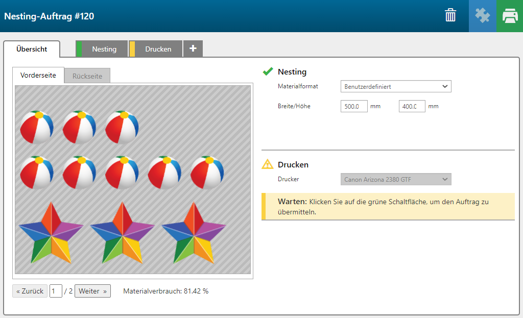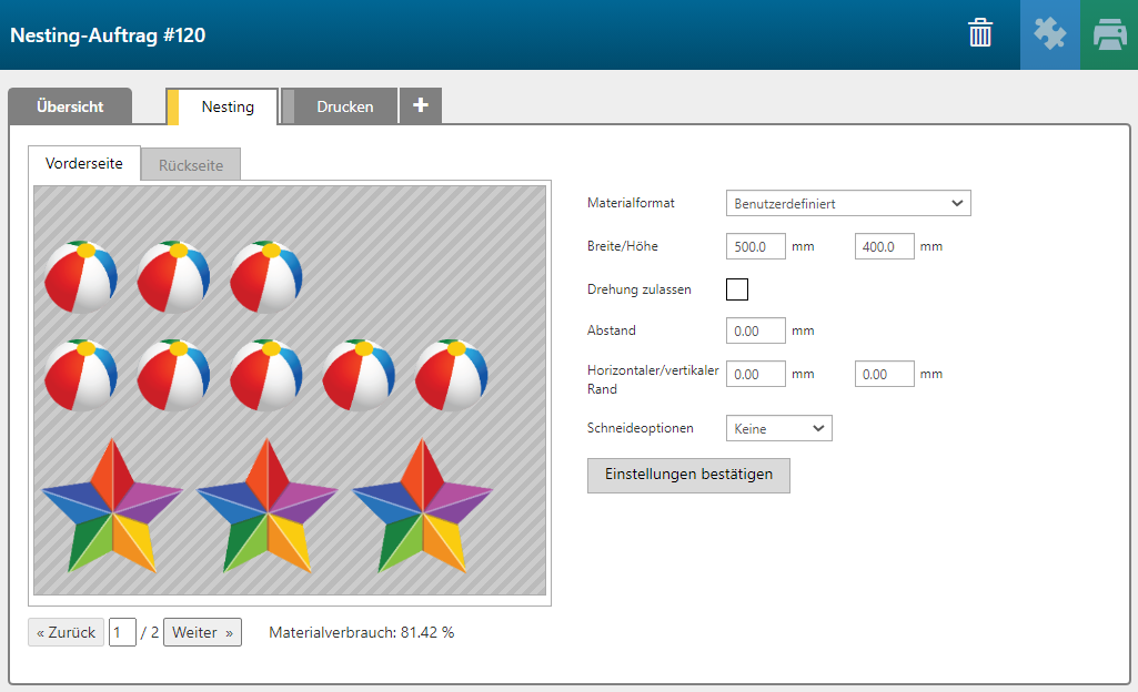 4. Überprüfen Sie die Einstellungen, und klicken Sie auf die Schaltfläche [Drucken], um den Nesting-Auftrag an den Drucker zu senden.