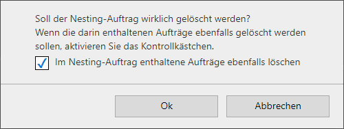 3. Wenn Sie im Bestätigungsfenster das Kontrollkästchen aktivieren, werden alle zum Nesting-Auftrag hinzugefügten Aufträge ebenfalls gelöscht. Wenn die einzelnen Aufträge in der Auftragsliste verbleiben sollen, lassen Sie das Kontrollkästchen deaktiviert.