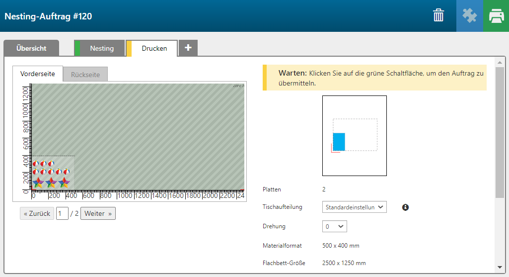 Nach dem Hinzufügen des Auftrags zum Nesting-Auftrag können die Einstellungen des Auftrags nicht mehr geändert werden.