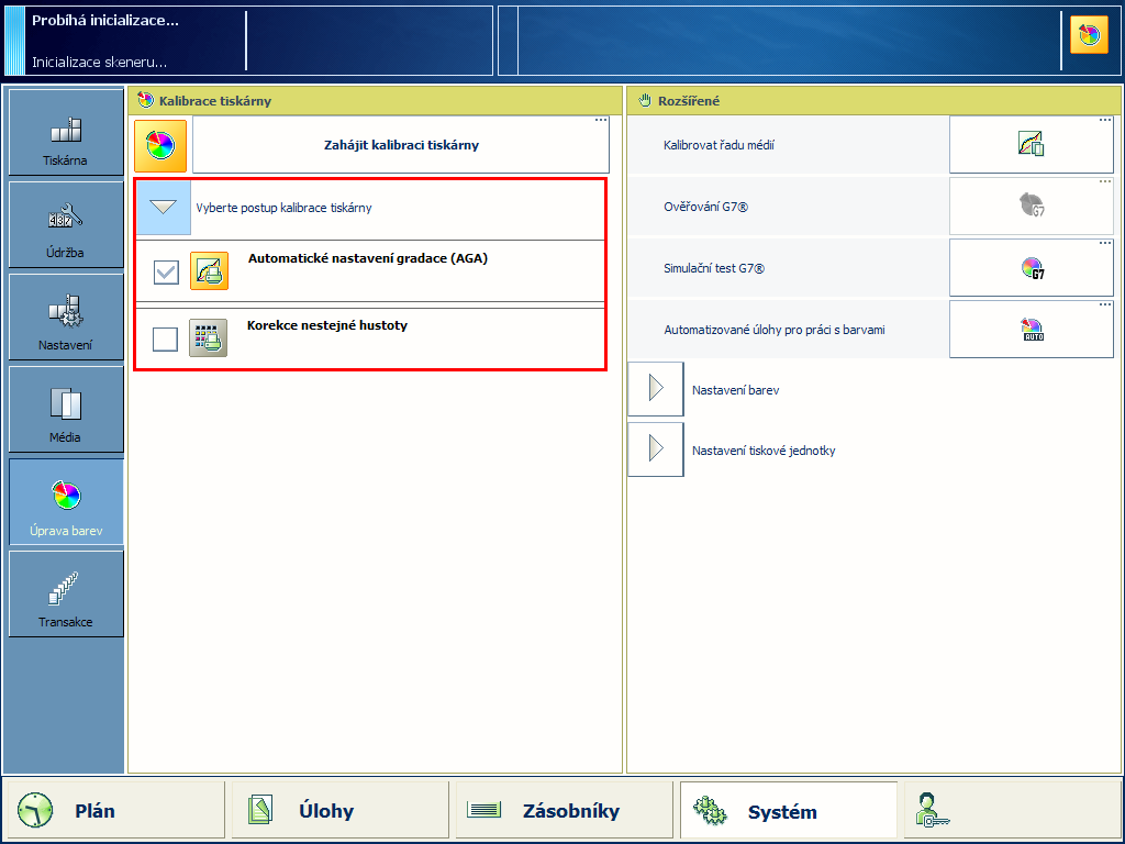 V rámci tohoto postupu systém vytiskne schémata kalibrace. Pro automatické měření těchto grafů používá tiskárna interní skener nebo volitelnou snímací jednotku.