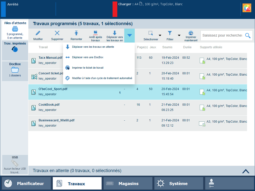 Vous pouvez vérifier les paramètres des travaux en imprimant un ticket de travail. L'impression du ticket du travail passe en dernière position dans la liste des travaux planifiés. Le ticket de travail est imprimé dans la langue de l'imprimante et affiche les propriétés du travail.