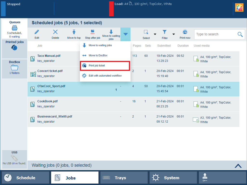 You can check the job settings by printing a job ticket. The job ticket print goes to the last position of the list of scheduled jobs. The job ticket is printed in the printer language and shows the job properties.