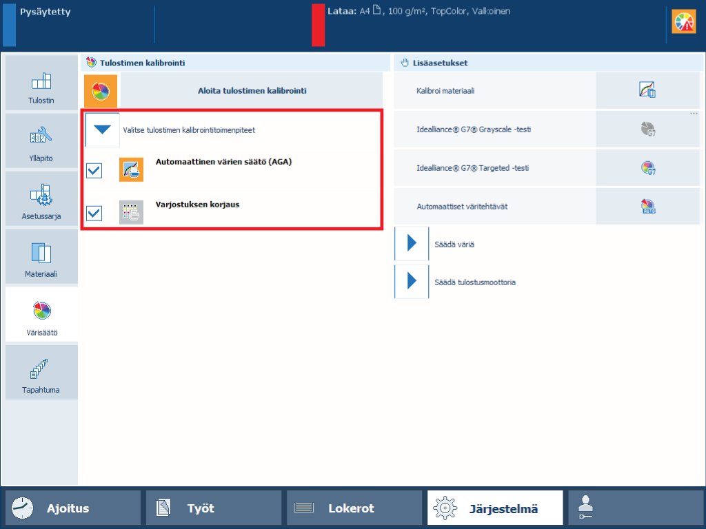Järjestelmä tulostaa tässä yhteydessä kalibrointikaaviot. Tulostin voi käyttää sisäistä skanneria ja valinnaista tunnistinyksikköä näiden mittauskaavioiden automaattiseen mittaamiseen.