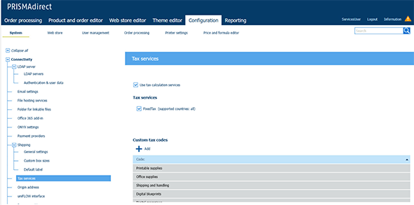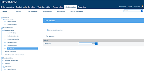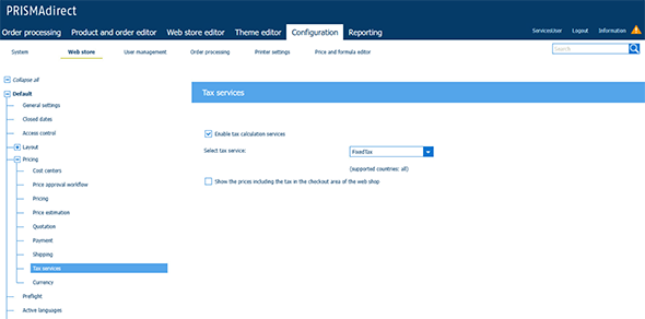 Ahora, los servicios de cálculo de impuestos están habilitados en PRISMAdirect. Sin embargo, PRISMAdirect puede ejecutar varios servidores web. Ahora, tiene que habilitar o deshabilitar los servicios tributarios en cada servidor web (consulte el procedimiento Configurar los servicios tributarios de cada servidor web más abajo).