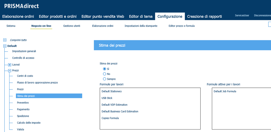 La formula per la stima dei prezzi viene utilizzata quando il cliente inoltra un ordine. La formula di preventivo può essere utilizzata solo dall'operatore dopo la ricezione dell'ordine.