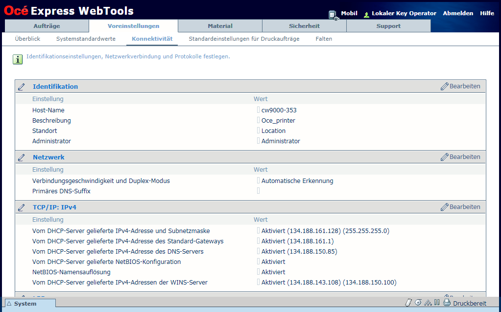 Mit den Einstellungen unter [Voreinstellungen] - [Konnektivität] können Sie das System in der eigenen Infrastruktur gemäß den bei Ihnen geltenden Standards installieren. Diese Einstellungen werden während der Installation konfiguriert und brauchen normalerweise nur selten geändert zu werden.