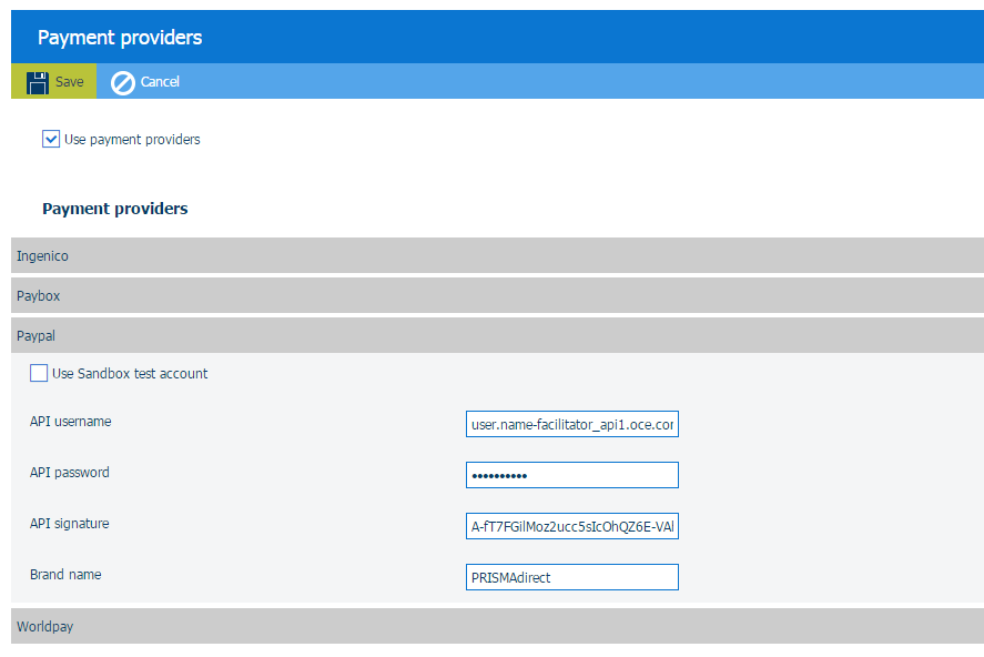 Klepněte na panel poskytovatele plateb, kterého chcete konfigurovat. Příklad: PayPal. Panel se rozbalí a vy můžete vyplnit požadovaná nastavení. Každý poskytovatel plateb vám poskytne požadovaná nastavení při vytvoření obchodního účtu.