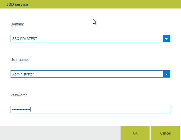 Vyberte doménu a jméno uživatele. Můžete například vybrat uživatele, který spouští služby aplikace PRISMAdirect. Pokud chcete použít služby hostingu souborů nebo poskytovatele plateb, musí mít uživatel přístup k internetu.