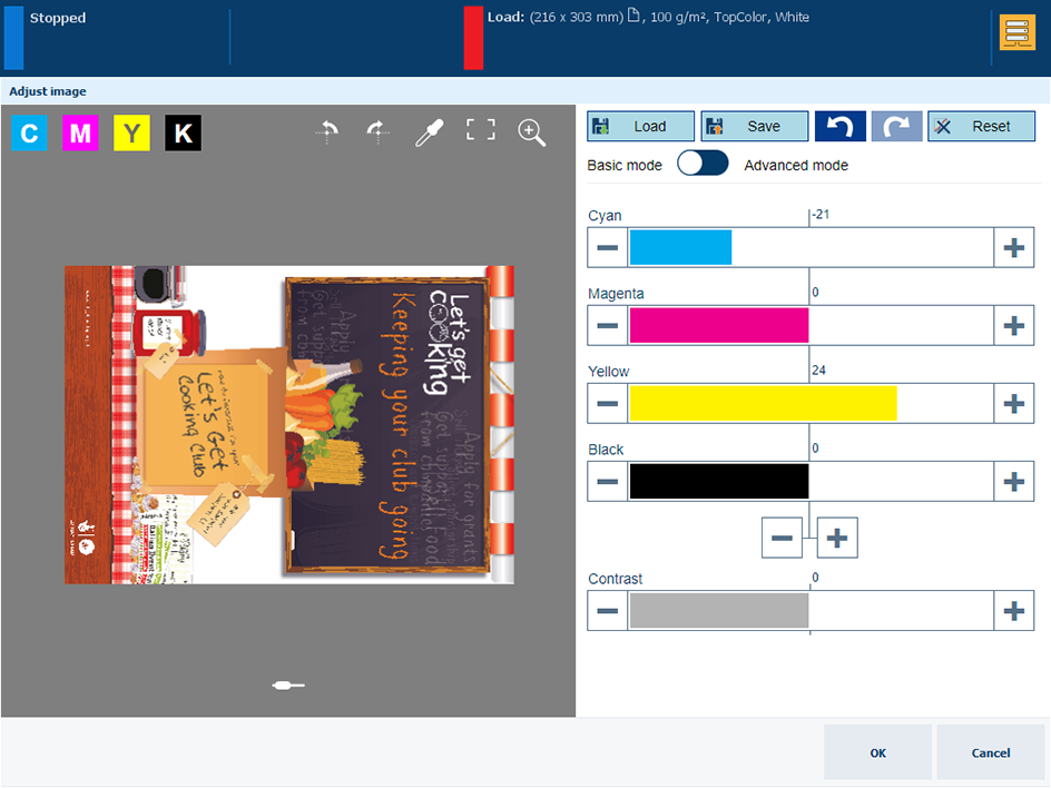 PRISMAsync Print Server offers a CMYK editor with a pixel-precise preview to adjust the color density for specific media. You can emphasize colors or other elements for images printed on media that belong to a media family. The new CMYK curves are added to the media family calibration values.