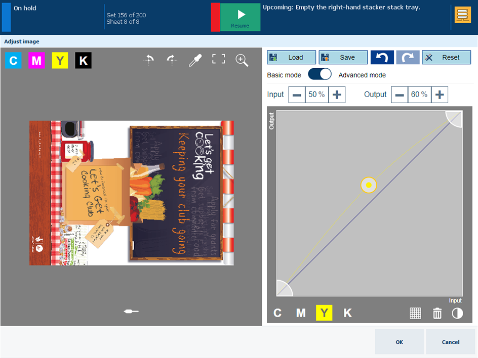 PRISMAsync Print Server offers a CMYK editor with a pixel-precise preview to adjust the color density for specific media. You can emphasize colors or other elements for images printed on media that belong to a media family. The new CMYK curves are added to the media family calibration values.