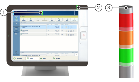 Den lodrette statuslinje på infopanelet, status-LED'en på kontrolpanelet og advarselslampen for operatøren viser den samme statusfarve. PRISMAsync Remote Manager og PRISMAsync Remote Control viser statusfarven eksternt.