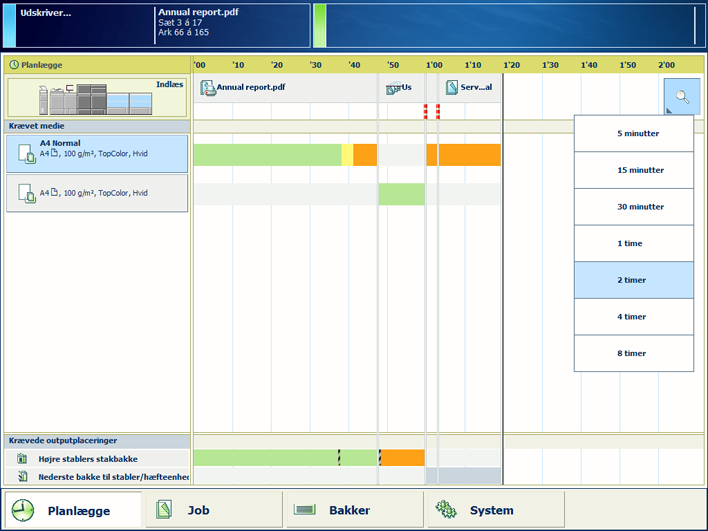 Skemaet er en daglig planlægningstavle til op til 8 timer i kontrolpanelet. Det viser listen over planlagte job og forudsiger deres jobproduktionstid.
