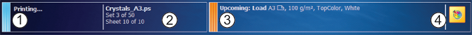 Dashboardet viser printerstatussen (1), navnet og statussen for det aktive job eller streamingjob (2) og meddelelser (3) og ikoner (4) for forventede handlinger. Hvis du vil forhindre, at printeren stopper, skal du jævnligt kontrollere påfyldningsniveauerne for forbrugsvarer og spild.