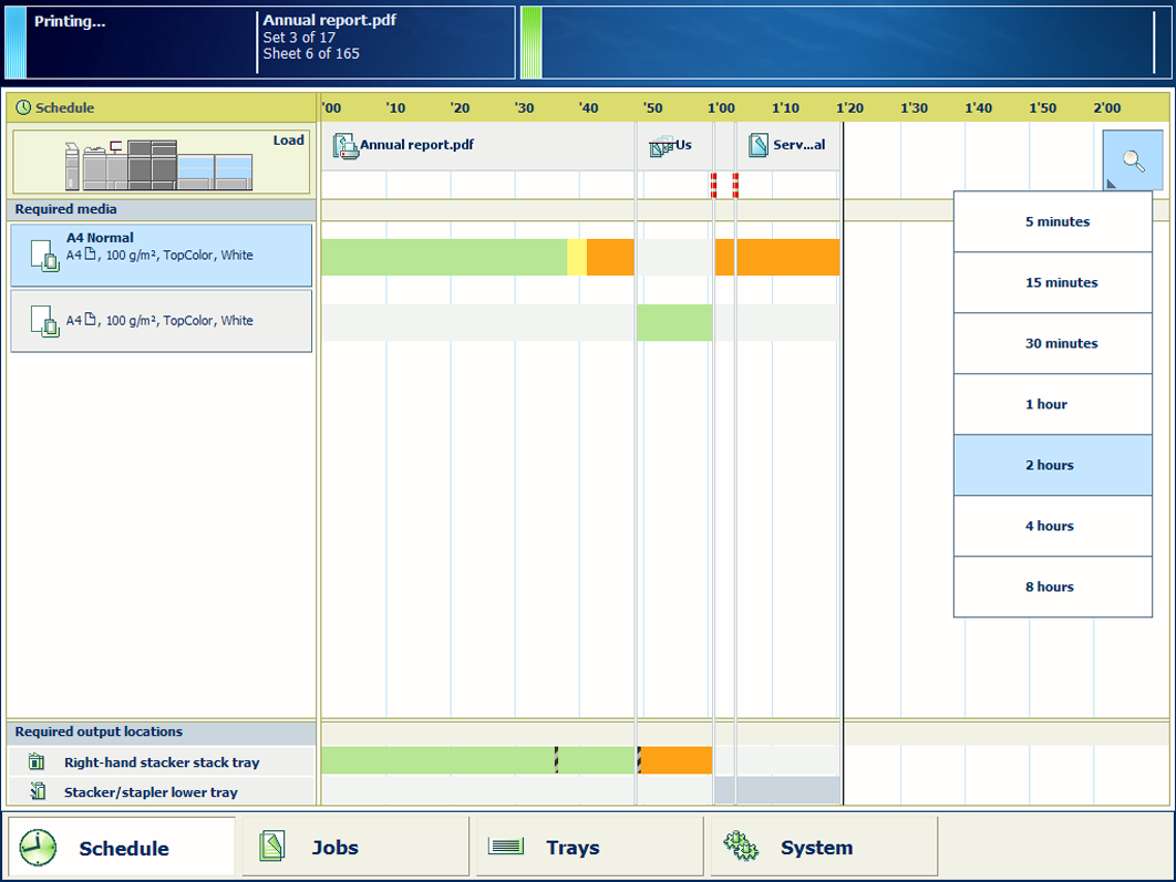 Ajoitus on ohjauspaneelissa sijaitseva päivittäinen enintään kahdeksan tunnin suunnitteluaikataulu. Siinä on ajoitettujen töiden luettelo ja arvio kyseisten töiden tuotantoajasta.