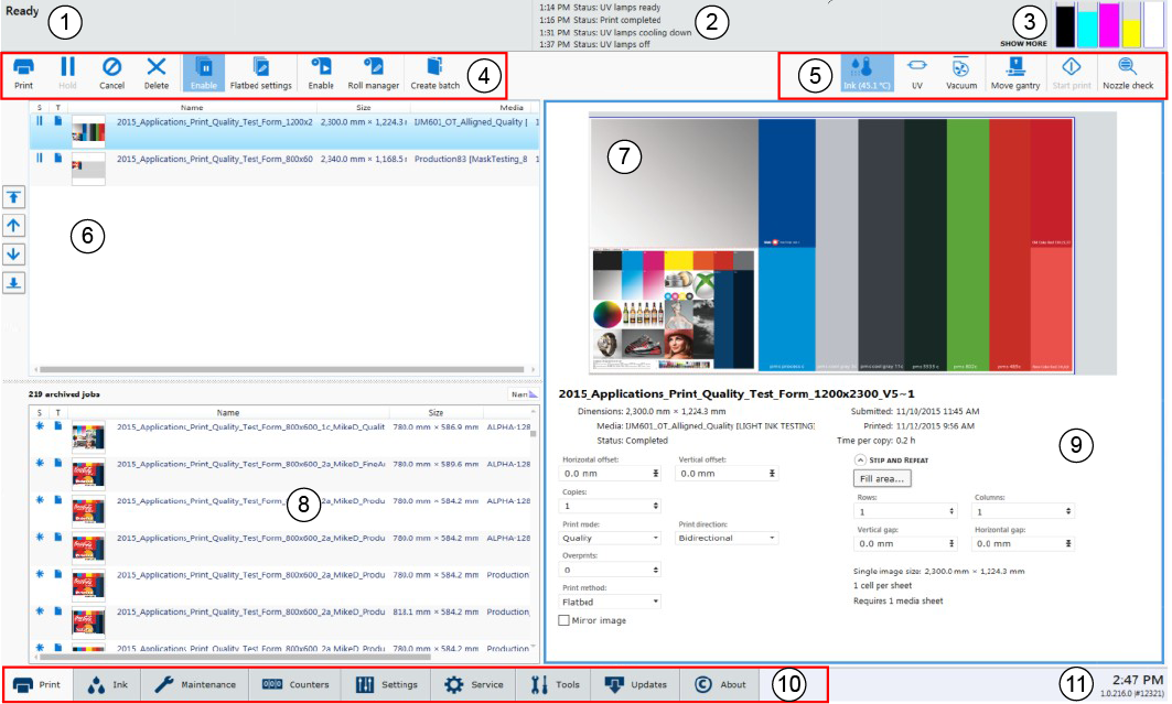 Controlul lucrărilor de tipărire este primul modul afișat atunci când se încarcă software-ul imprimantei. Din acest modul, puteți gestiona toate aspectele legate de lucrul cu lucrări de tipărire și controlați, de asemenea, multe caracteristici ale imprimantei. Tabelul „Panouri pentru controlul lucrărilor” documentează apelurile numerotate, iar restul acestei secțiuni explică mai detaliat fiecare din aceste zone.