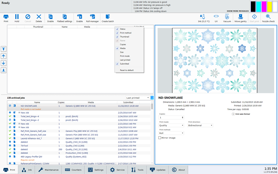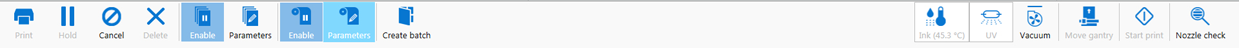Afișează pictograme pentru temperatura cernelii, controlul lămpilor, începerea lucrărilor de tipărire și tipărirea pentru verificarea duzelor. |