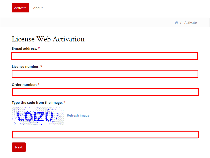 2. Saisissez les données demandées et cliquez sur [Next] (Suivant). Indiquez la même adresse e-mail que celle utilisée pour créer le fichier de demande de licence.