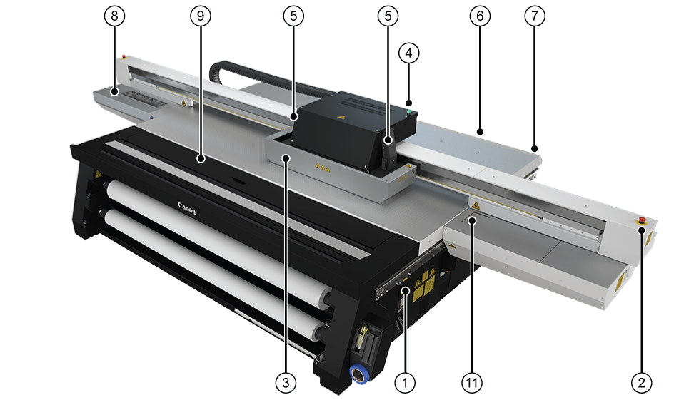 Butoanele de oprire de urgență pot opri toate sistemele de mișcare și periculoase. Există trei opriri de urgență, una la stația de comandă pentru operator și una la fiecare capăt al cadrului. |