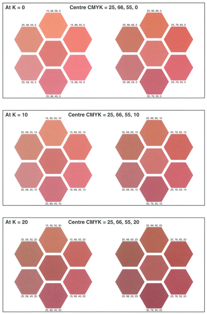 When you add or edit a spot color definition, you can print a patch chart to check how the set CMYK values and small variations on these values appear on media. The printed colors and the CMYK values of the patches give the best visual match to fine-tune the spot color for the given media family.