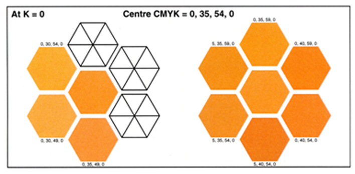 Patches with a black cross When a color value is equal to a color value of an other patch, one of the patches appear as a white patch with a black cross. |