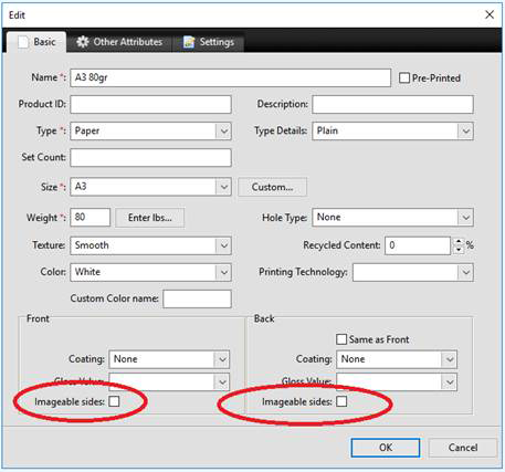 Når du aktiverer JDF-udskrivningsstien og angiver kataloget papir til "JDF-baseret", opstår der imidlertid et problem med eksisterende medier. Alle eksisterende medier på printserveren modtager værdien "Fra" for medieattributten "Billedforberedte sider". Fiery-printserveren kan ikke håndtere disse medier som skilleark. PRISMAprepare modtager imidlertid dette medie som medier af typen "Skilleark".